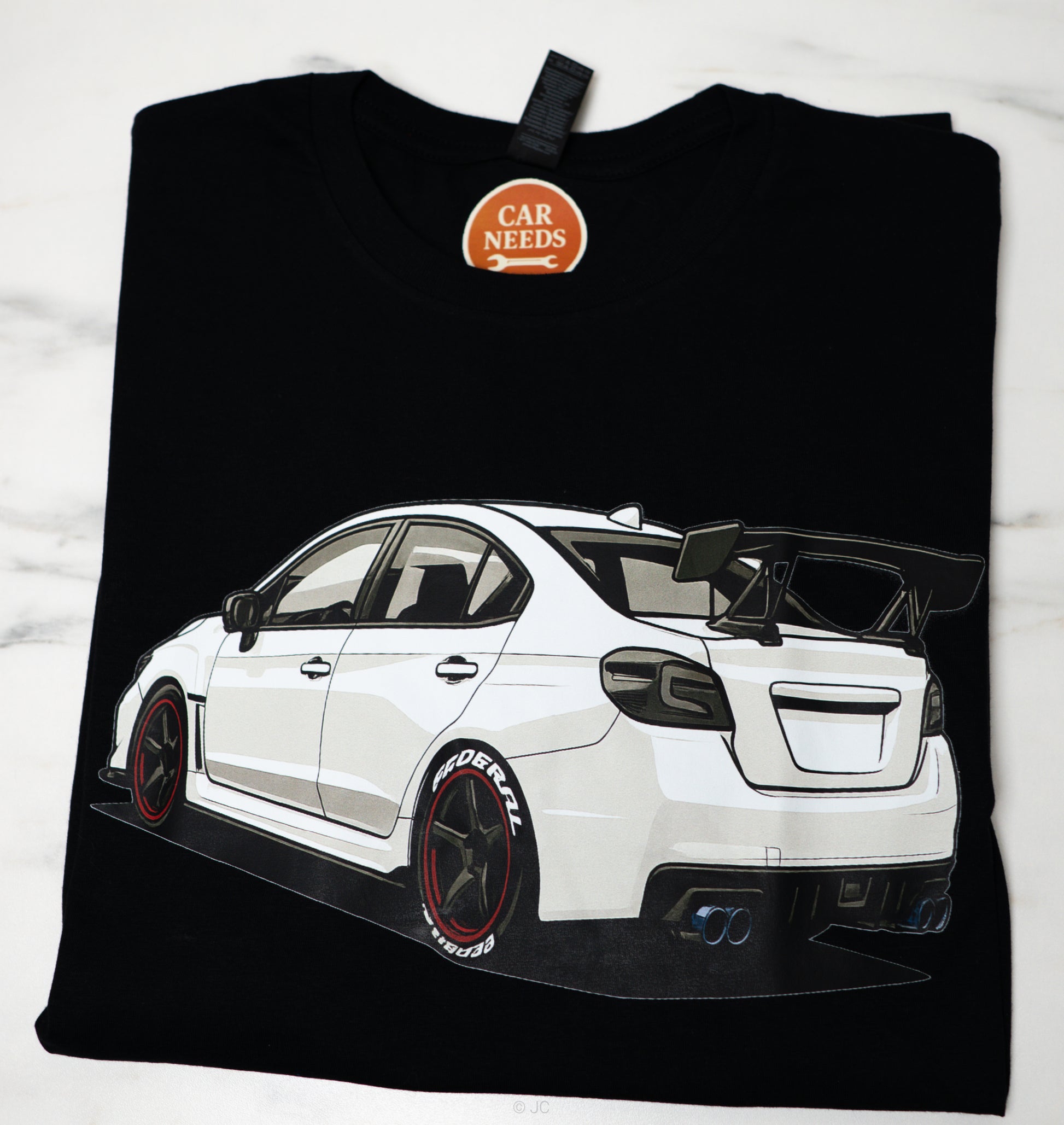 This premium tee features a clean, illustrated rear-view design of a white Subaru WRX STI, complete with aero wing, red wheels, quad exhaust, and subtle street styling — exactly as shown in your product sample.