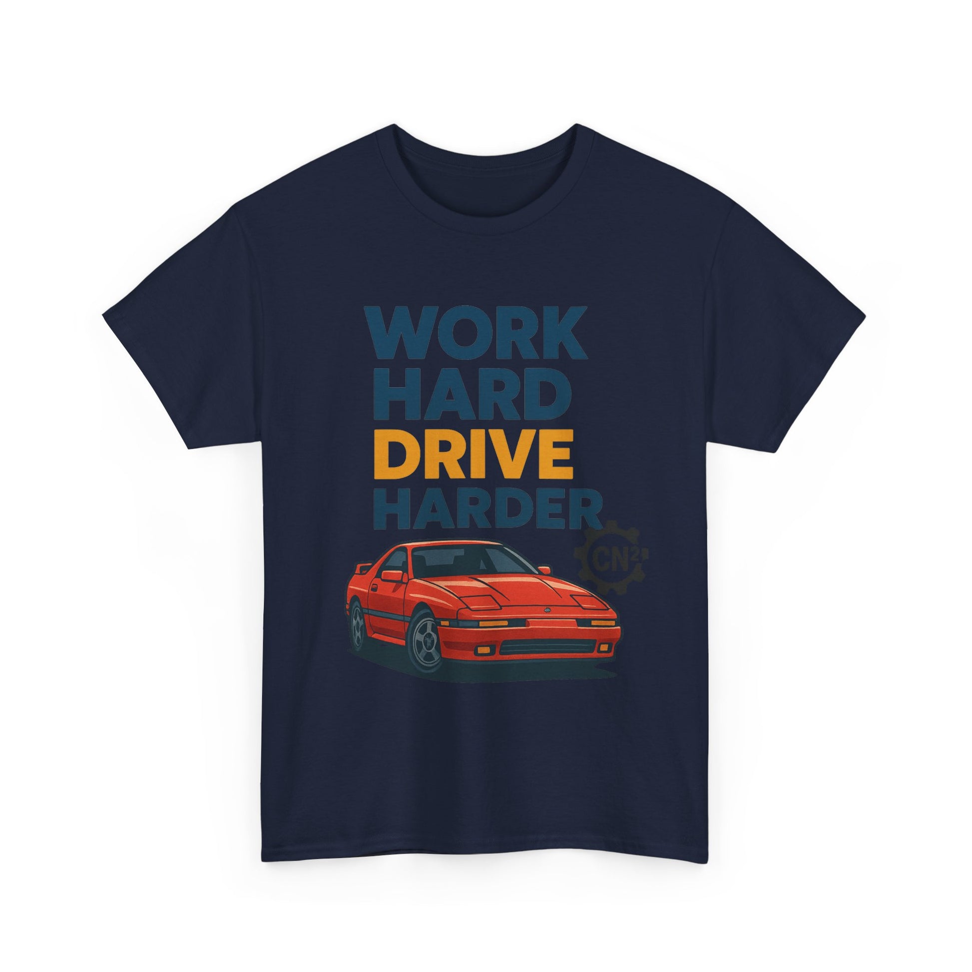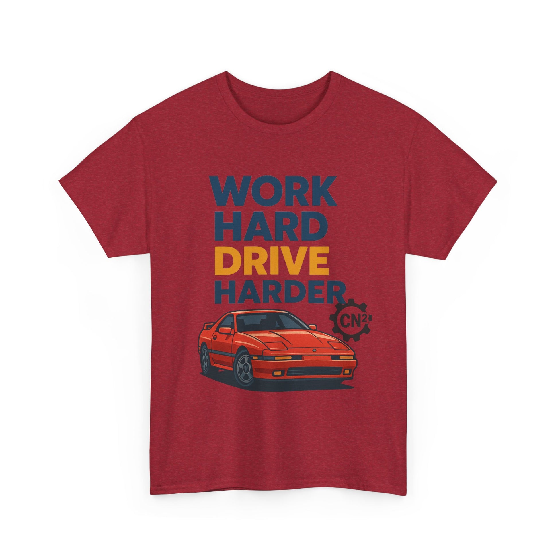 This white classic-fit tee pairs clean, bold typography with a vintage sports car illustration to celebrate grit and gearhead ambition. The front print reads “WORK HARD DRIVE HARDER” in stacked, high-contrast lettering with the word DRIVE highlighted, sitting above a detailed red coupe rendered with crisp lines and shadow for a slightly retro, poster-like vibe. Wear it to the garage, a weekend cruise, or while chasing small wins at the office — it reads as a confident, quietly rebellious statement: you hustle, and you reward yourself with the drive. The soft, durable cotton and tear-away label keep focus on the message and comfort, while the midweight fabric holds print detail well so the artwork stays sharp wash after wash.